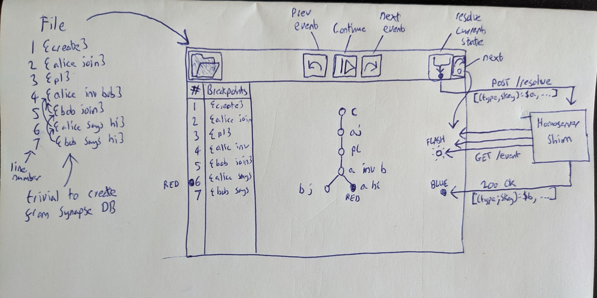 With that in mind, I recently spent some time working on a visualisation tool based on a project Matthew first wrote back in 2020 called TARDIS - Time Agnostic Room DAG Inspection Service. The backronym is surprisingly accurate. With this tool, you can step through "debugger-style" events in a room, seeing the shape of the DAG change. Originally this was all it could do, but I knew it could be so much more, so I set about prototyping the improvements I would make to it.