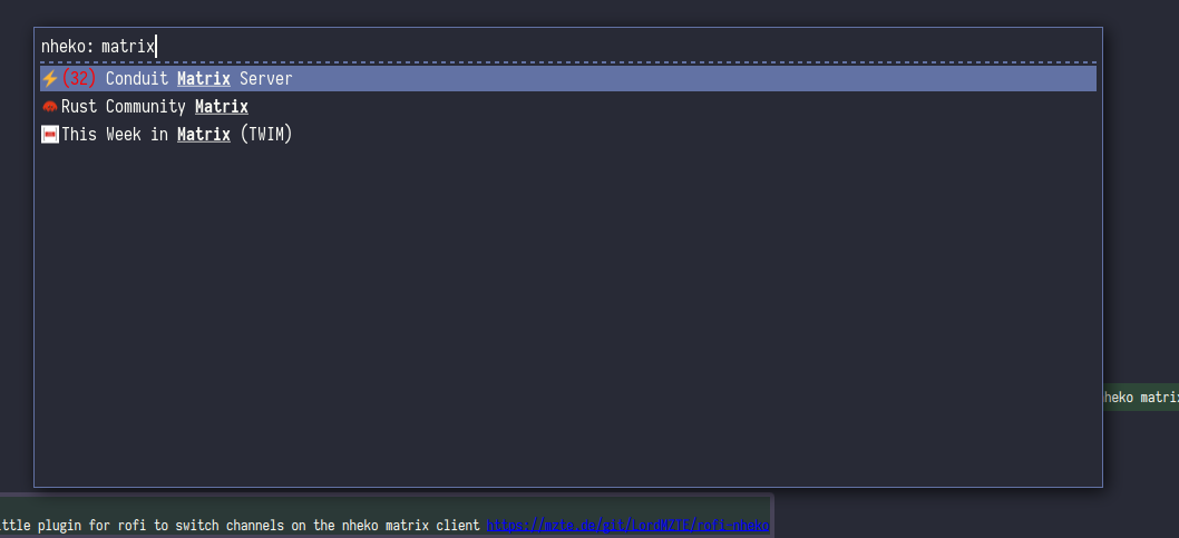 rofi is a application launcher and dmenu replacement. https://github.com/davatorium/rofi. I made a little plugin for it to switch channels on the nheko matrix client https://mzte.de/git/LordMZTE/rofi-nheko