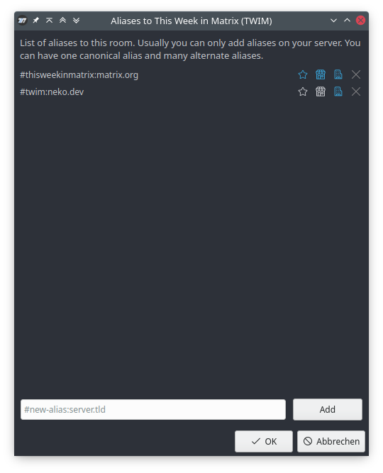 You can now edit aliases in Nheko! This means you can publish your own aliases in the room directory as well as in the room. If an alias can't be used by people (because it isn't listed in the room directory), that alias is highlighted in red with an easy option to fix it (if you have permissions to do so). You can also easily switch the primary (canonical) alias of the room.