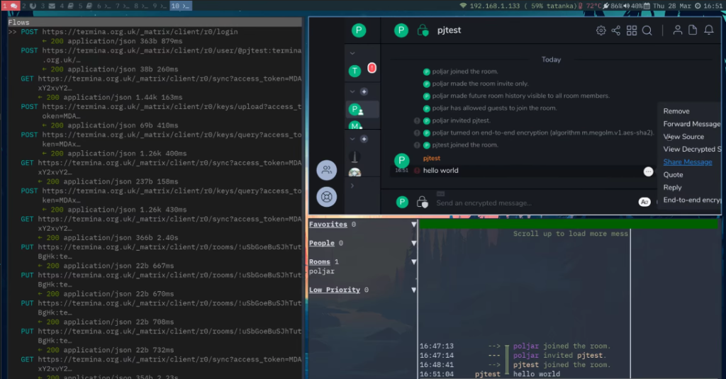 Last month at FOSDEM 2019 we gave a talk about a new experimental ultra-low-bandwidth transport for Matrix which swaps our baseline HTTPS+JSON transport for a custom one built on CoAP+CBOR+Noise+Flate+UDP.Β (CoAP is the RPC protocol; CBOR is the encoding; Noise powers the transport layer encryption; Flate compresses everything uses predefined compression maps).
