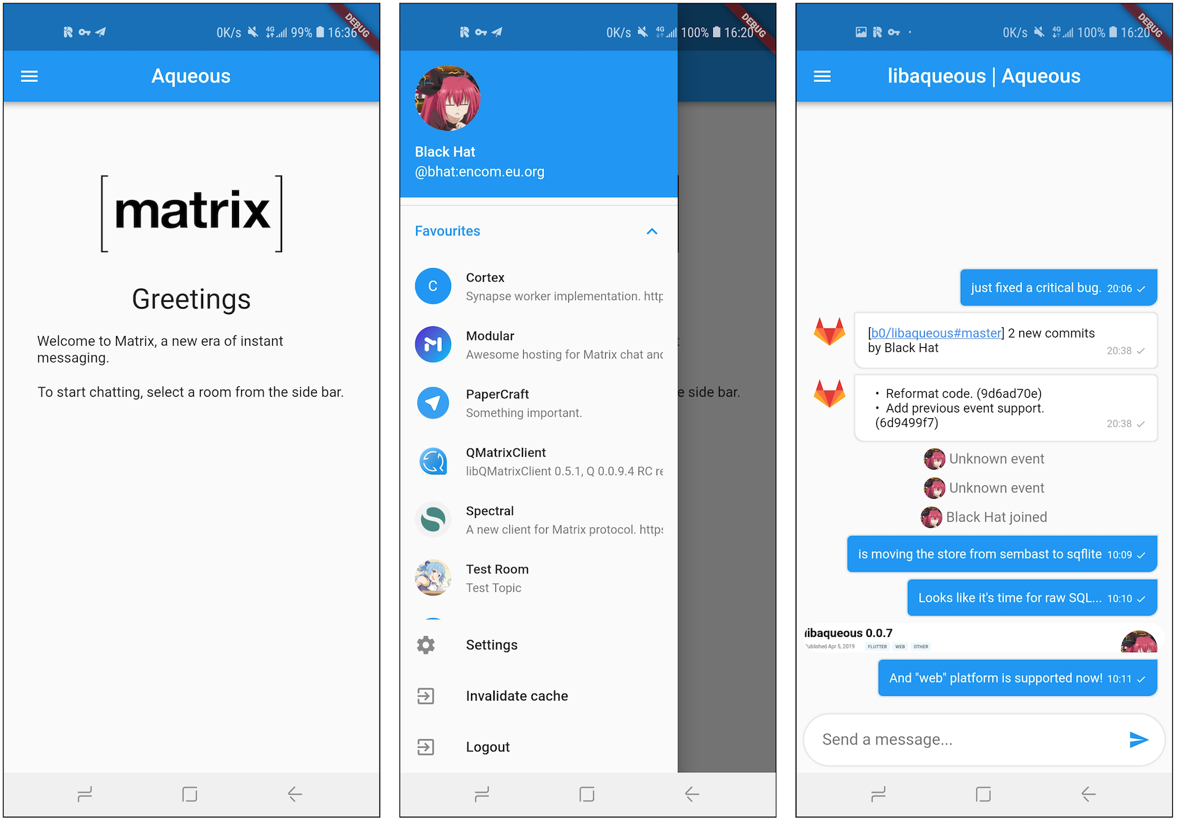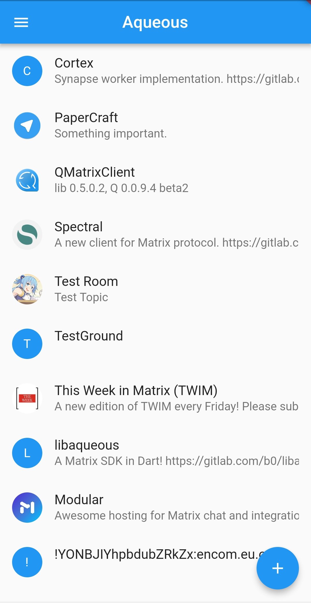 I am trying to use libaqueous(Matrix Dart SDK) to create a cross-platform matrix client for Android and iOS. Almost nothing works except Already a significant number of client features are available: login/logout, room list, basic timeline and message posting