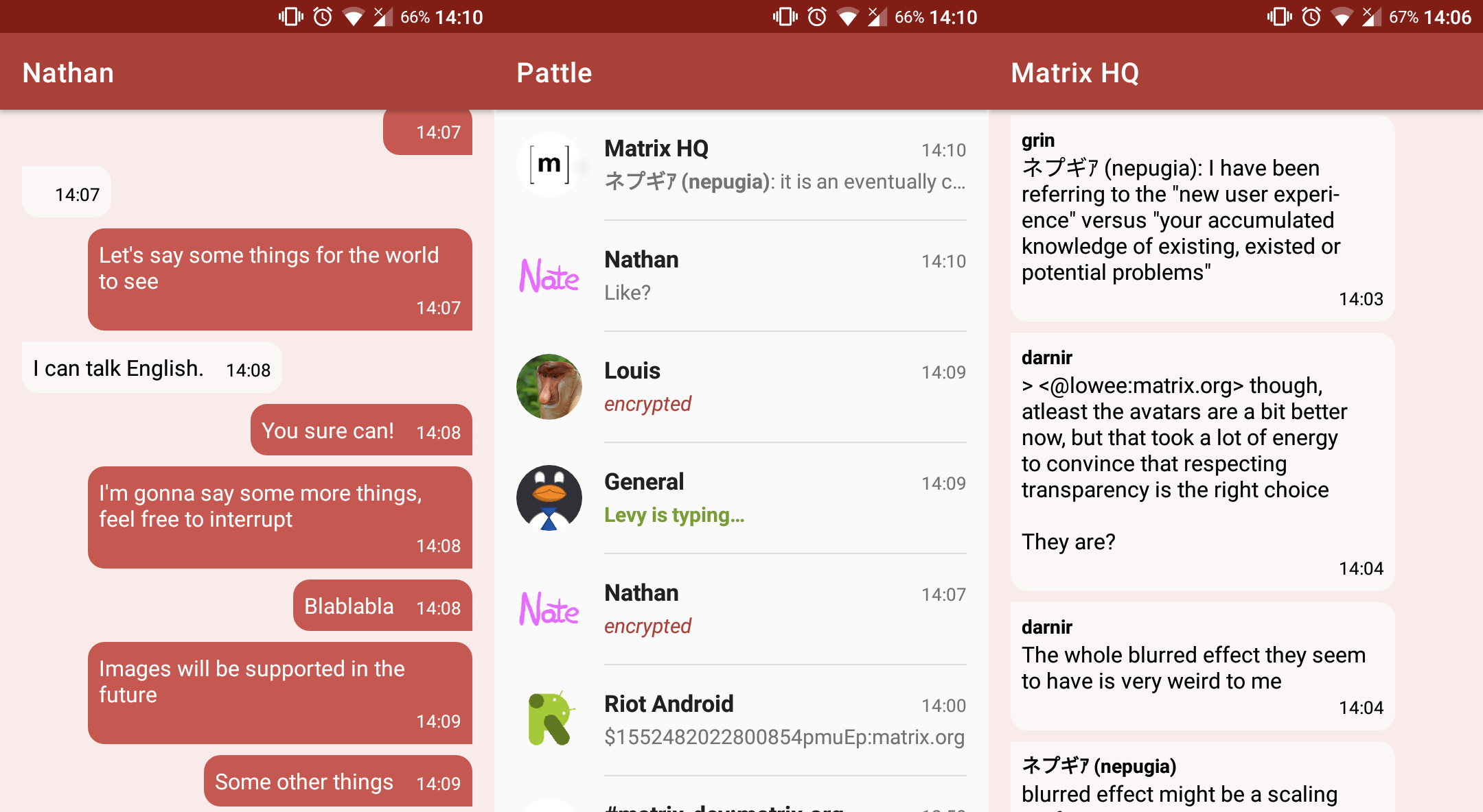 Hey all, I've been working on my Matrix Android app, Pattle! The goal of Pattle is to be an easy to use app for Matrix, with it's design inspired by popular apps such as WhatsApp and Telegram. Development happens here, and contributions are encouraged! The app is not currently suited for daily use, but some functionality is there, such as registering, logging in and viewing chats.