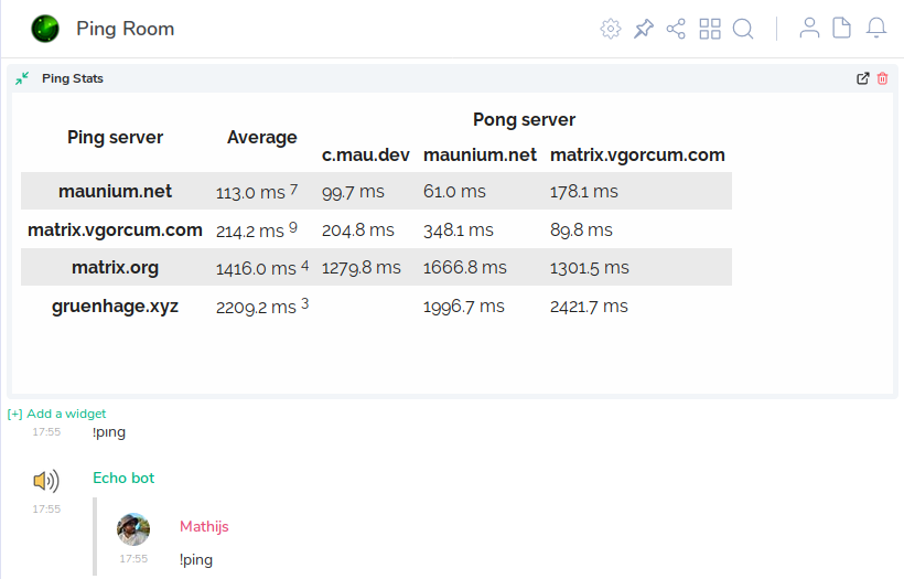I made a room for !pinging echo maubots: #ping:maunium.net. The room has a bunch of echo bots, currently on maunium.net, c.mau.dev and matrix.vgorcum.com. It also has a new maubot plugin called pingstat, which collects the pong data and makes a leaderboard website. The website is linked to the room as a widget.