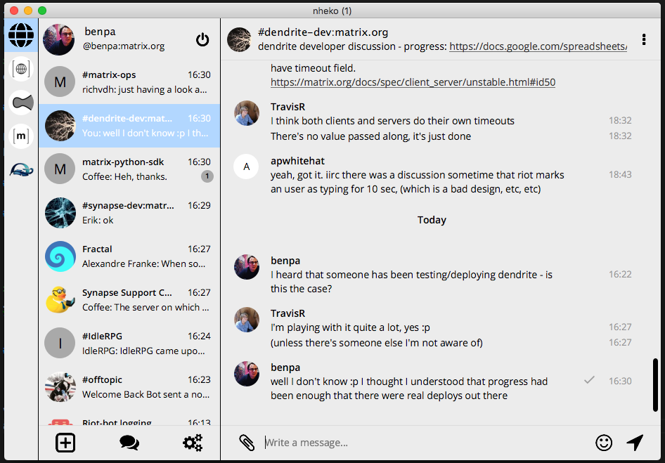 Meanwhile on Riot/Web, Lazy Loading members is pretty much complete - just writing end-to-end tests to ensure that encryption still works well when lazy loading is enabled.Β Next up is actually progressing the redesign at last!