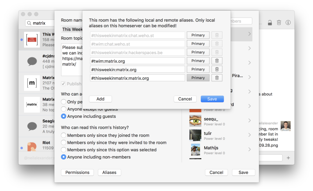 - room settings (history/join rules and changing aliases/addresses)