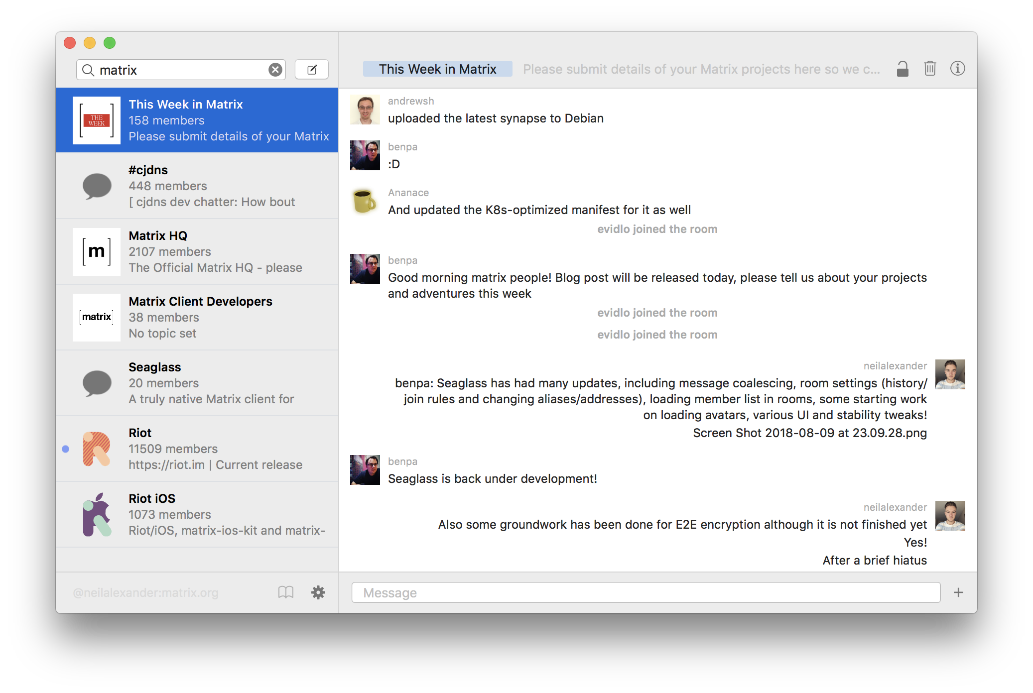Seaglass now supports E2E rooms, leveraging matrix-ios-sdk! Additionally, maintainer neilalexander has had a productive week: