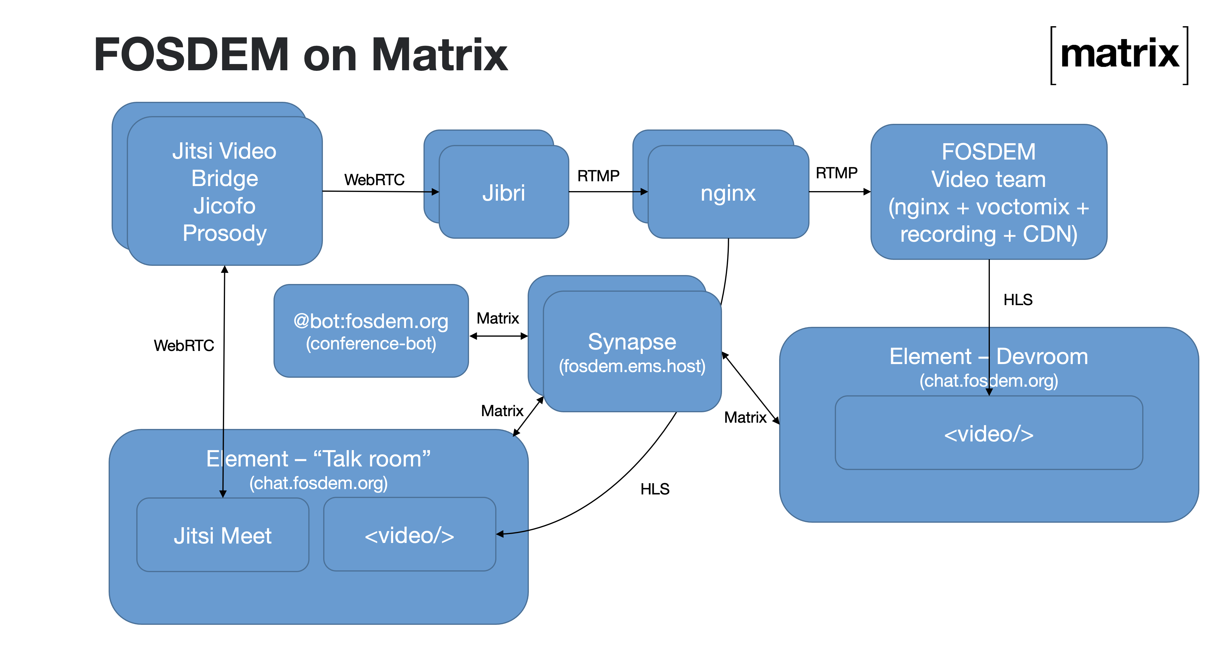 If you want to know more, we also did a talk about FOSDEM-on-Matrix in this month's Open Tech Will Save Us meetup and the Building Massive Virtual Communities on Matrix talk at FOSDEM went into more detail too. Our historical Taking FOSDEM online via Matrix blog has been somewhat overtaken by events but gives further context still.