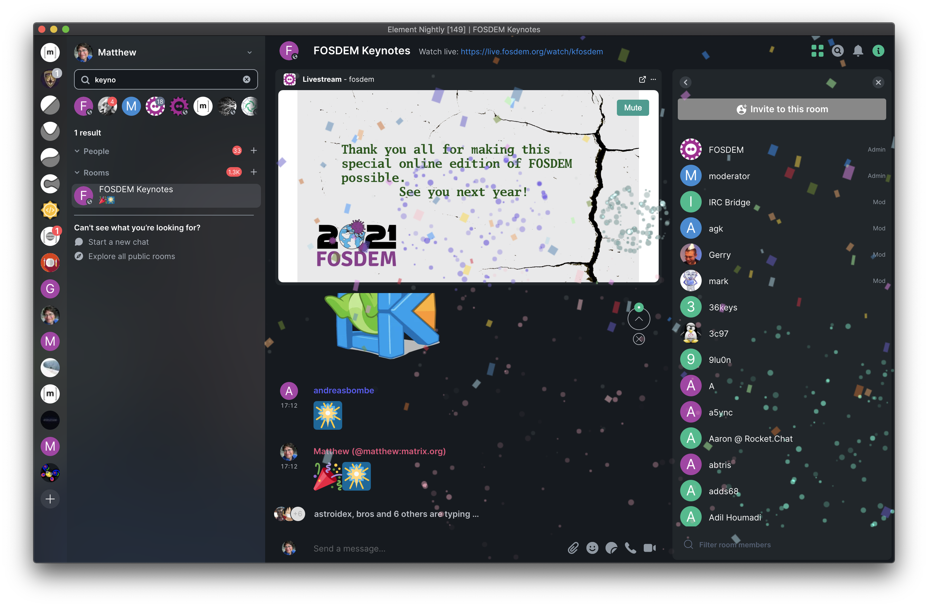 So, there you have it. We hope that this shows that it's possible to host successful large-scale conferences on Matrix using an entirely open source stack, and we hope that other events will be inspired to go online via Matrix! We should give a big shout out to HOPE, who independently trailblazed running conferences on Matrix last year and inspired us to make FOSDEM work.