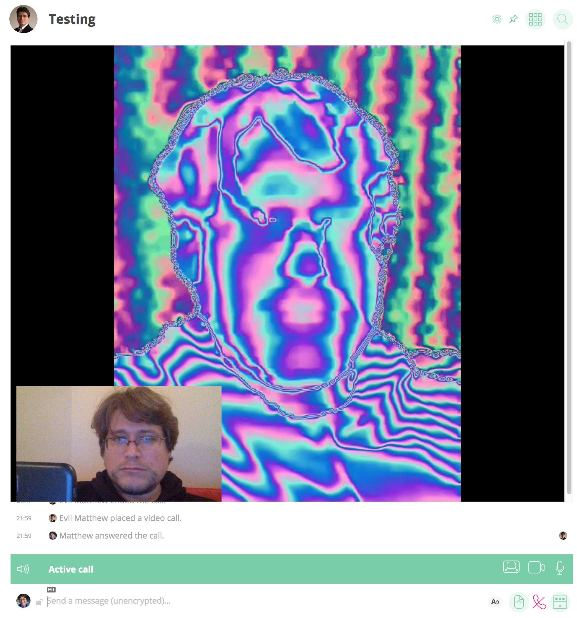Placing a video call through to another Matrix client then coughed up a video stream that looks like this:
