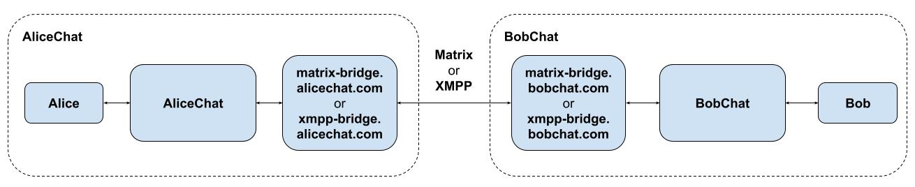 In this thought experiment, the bridge used would be up to the destination provider. For instance, bobchat.com could announce that AliceChat users should connect to it via alicechat-bridge.bobchat.com using the AliceChat protocol(or matrix-bridge.bobchat.com via Matrix or xmpp-bridge.bobchat.com via XMPP) by a simple HTTP API or even a .well-known URL. Users might also be able to override the bridge used to connect to them (e.g. to point instead at a client-side bridge), and could sign the advertisement to prove that it hadn’t been tampered with.