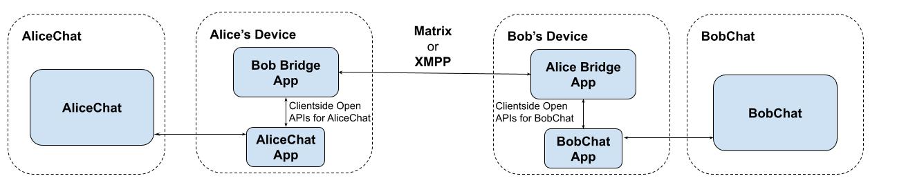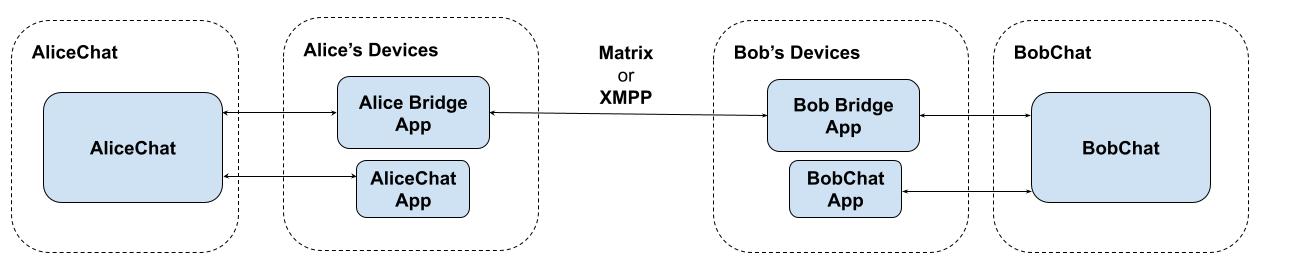 Please note that while these examples show server-side bridges, in practice it would be infinitely preferable to use client-side bridges when connecting to E2EE services - meaning that decrypted message data would only ever be exposed on the client (which obviously has access to the decrypted data already). Client-side bridges are currently complicated by OS limits on background tasks and push notification semantics (on mobile, at least), but one could envisage a scenario where you install a little stub AliceChat client on your phone which auths you with AliceChat and then sits in the background receiving messages and bridging them through to Matrix or XMPP, like this: