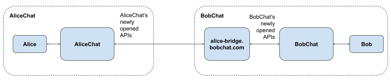 Now, AliceChat itself needs to figure out how to query the remote service provider to see if Bob actually exists there. Given the DMA requires that gatekeepers provide open APIs with the same level of security to remote users as their local ones using today’s private APIs - and very deliberately doesn’t mandate specific protocols for interoperability - they will need to locate a bridge which can connect to the other system.