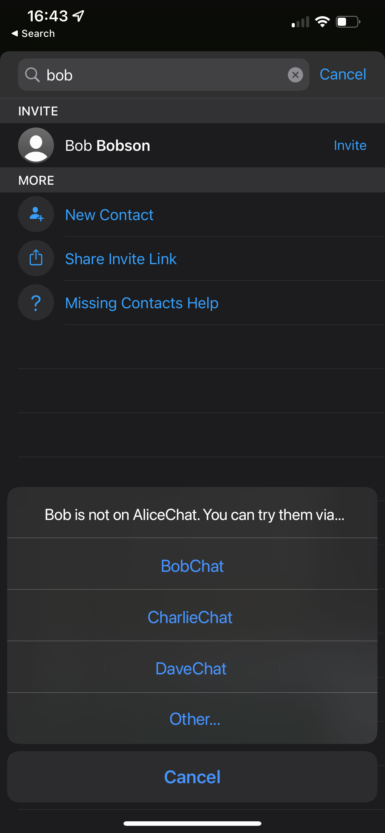 Now, the simplest approach in the short term would be for each gatekeeper to pre-provision a set of options of possible alternative networks. (The DMA says that, on request, other service providers can ask to have access to the gatekeeper’s APIs for the purposes of interoperability, so the gatekeeper knows who the alternative networks may be). “Bob is not on AliceChat - do you want to try to reach him instead on BobChat, CharlieChat, DaveChat (etc)”.