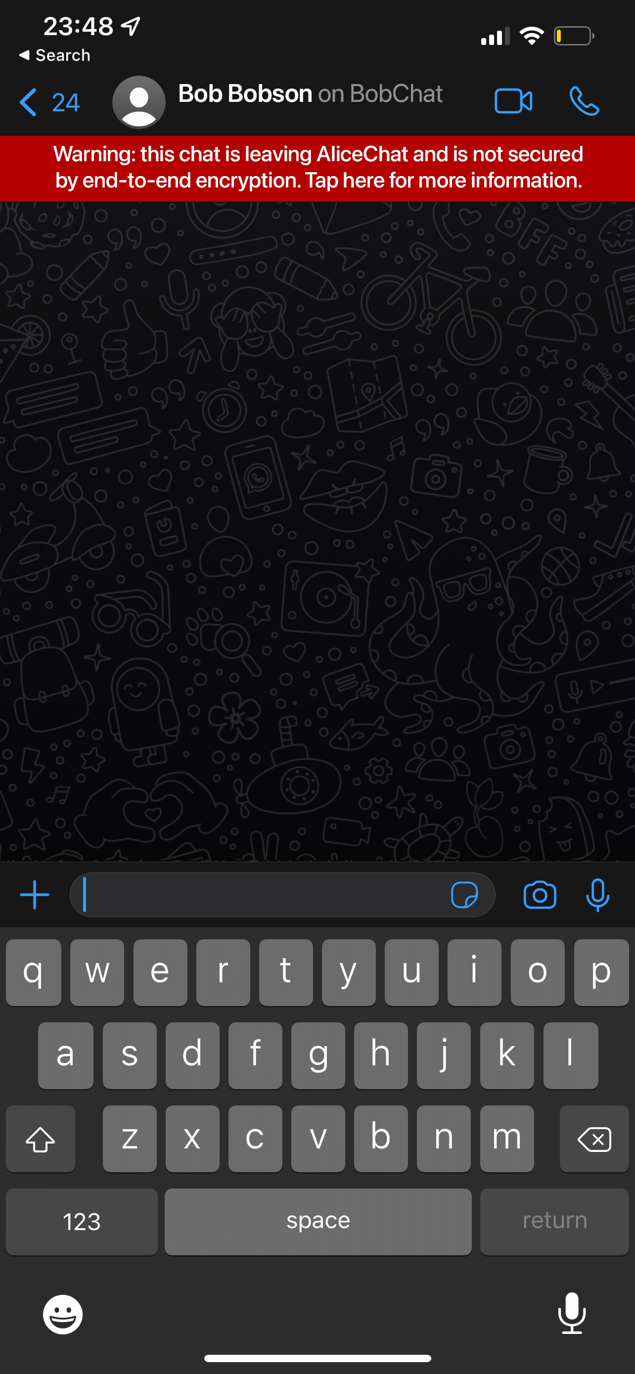 Meanwhile, Alice still needs to talk to Bob. As already discussed, unless everyone speaks the same end-to-end encrypted protocol (be it Matrix, WhatsApp or anything else), we inevitably have a trade-off here between interoperability and privacy if Bob is not on the same system as Alice (assuming AliceChat is end-to-end encrypted) - and we will need to clearly warn Alice that the conversation is no longer end-to-end encrypted:
