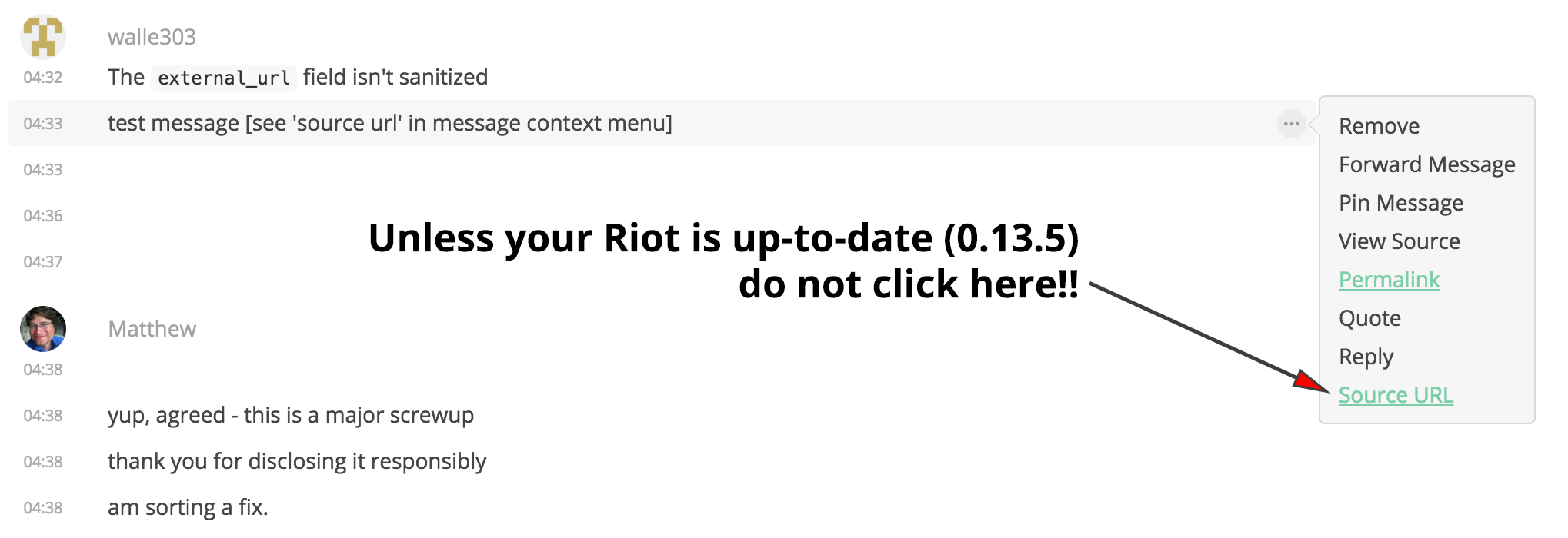 If you're not able to upgrade to Riot/Web 0.13.5 for some reason, then please do not click on the 'Source URL' feature on the event context menu:
