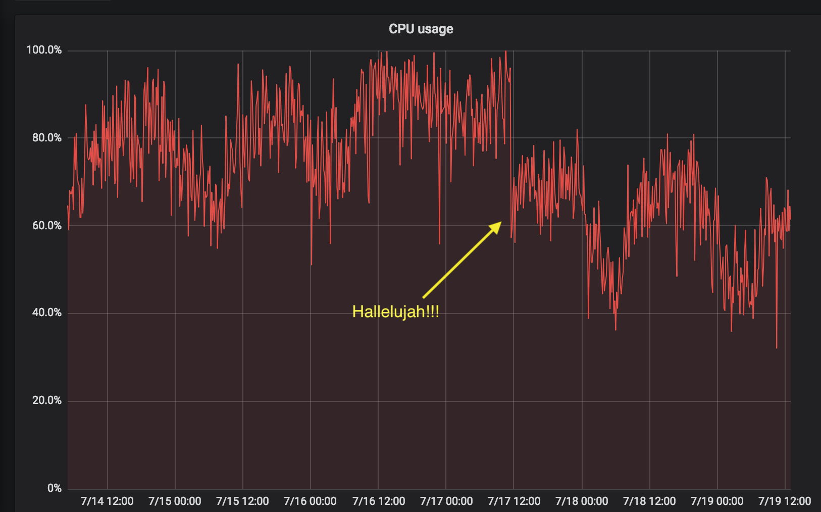 We've just released Synapse 0.33.0!  This is a major performance upgrade which speeds up /sync (i.e. receiving messages) by a factor of almost 2x!  This has already made a massive difference to the CPU usage and snappiness of the matrix.org homeserver since we rolled it out a few days ago - you can see the drop in sync worker CPU just before midday on July 17th; previously we were regularly hitting the CPU ceiling (at which point everything grinds to a halt) - now we're back down hovering between 40% and 60% CPU (at the current load).  This is actually fixing a bug which crept in around Synapse 0.31, so please upgrade - especially if Synapse has been feeling slower than usual recently, and especially if you are still on Synapse 0.31.