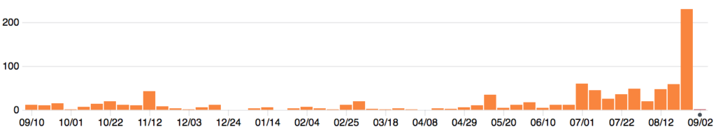 ...which clearly shows the original sprint to get the r0 of the CS API out the door at the end 2015, and then a more leisurely pace until the beginning of July 2018 since which the pace has picked up massively.  Other ways of looking at include the number of open issues...