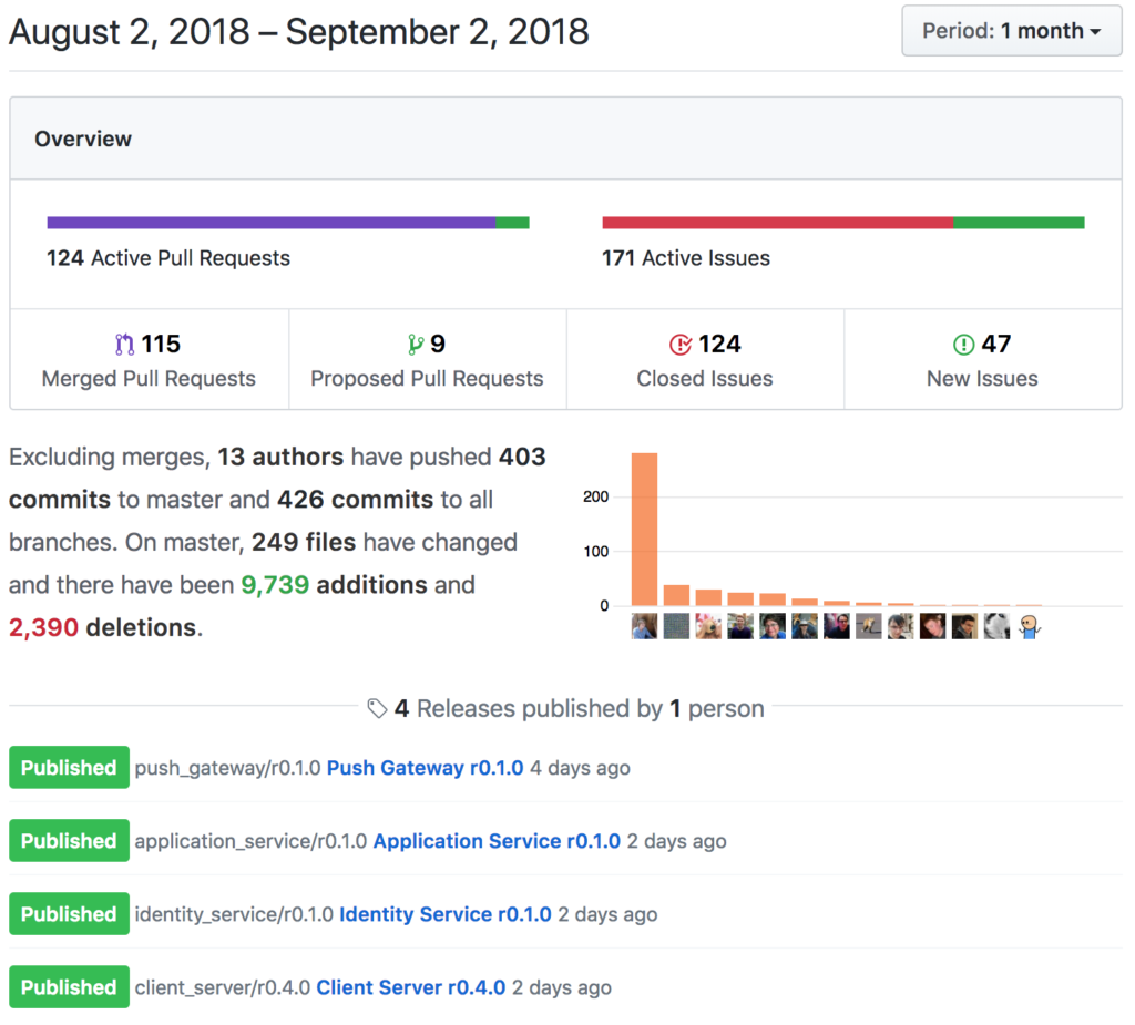...or the overall Github Project activity for August.  (It's impressive to see Zil0 sneaking in there on second place on the commit count, thanks to all his GSoC work documenting E2E encryption in the spec as part of implementing it in matrix-python-sdk!)