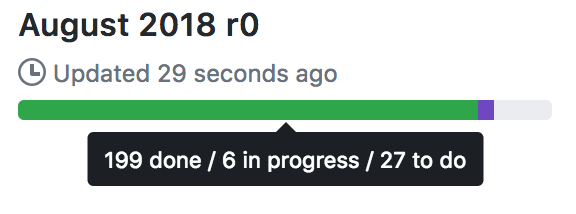 However, we haven't finished it all: despite our best efforts we're running slightly past the original target of Aug 31.  The current state of play for the r0 release overall (in terms of pending issues) is: ...and you can see the full breakdown over at the public Github project dashboard.