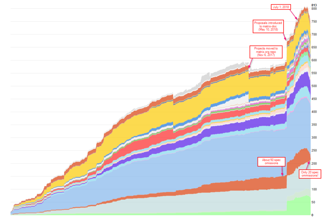 So, without further ado, we'd like to introduce https://matrix.org/docs/spec/proposals - a dashboard for all the spec change proposals we've accumulated so far (ignoring most of the ones which have already been merged), as well as a clearer workflow for how everyone can help improve the Matrix spec itself.  Part of this is introducing a formal numbering system - e.g. MSC1228 stands for Matrix Spec Change 1228 (where 1228 is the ID of the Github issue on the github.com/matrix-org/matrix-doc/issues repository that tracks the proposal).