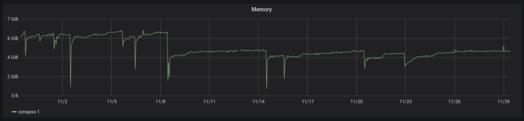 The Python 3 port has benefits other than just preparing for the End of Life of Python 2.7. Successive versions of Python 3 have improved the standard library, provided newer and clearer syntax for asynchronous code, added opt-in static typing to reduce bugs, and contained incremental performance and memory management improvements. These features, once Synapse stops supporting Python 2, can then be fully utilised to make Synapse's codebase clearer and more performant. One bonus that we get immediately, though, is Python 3's memory compaction of Unicode strings. Rather than storing as UCS-2/UTF-16 or UCS-4/UTF-32, it will instead store it in the smallest possible representation giving a 50%-75% memory improvement for strings only containing Latin-1 characters, such as nearly all dictionary keys, hashes, IDs, and a large proportion of messages being processed from English speaking countries. Non-English text will also see a memory improvement, as it can be commonly stored in only two bytes instead of the four in a UCS-4 “wide” Python 2 build.