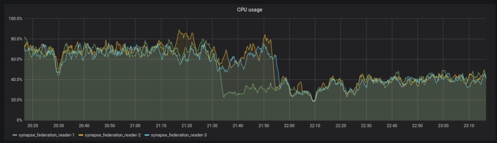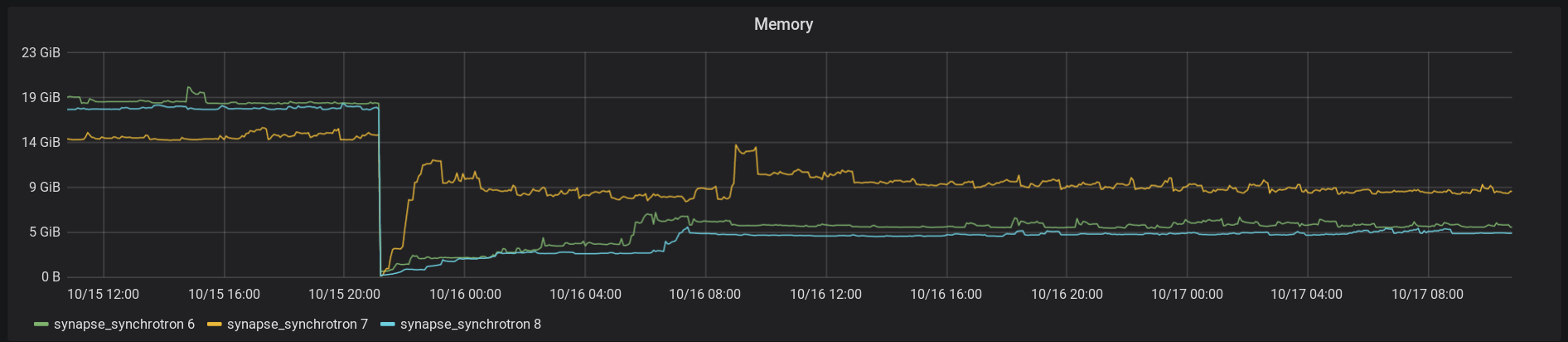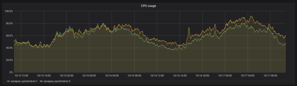 See 10/15, 4:00.The CPU utilisation has gone down on synchrotron 1 after the Python 3 migration, but not as dramatically as the federation reader. Synchrotron 3 was migrated a few days later.