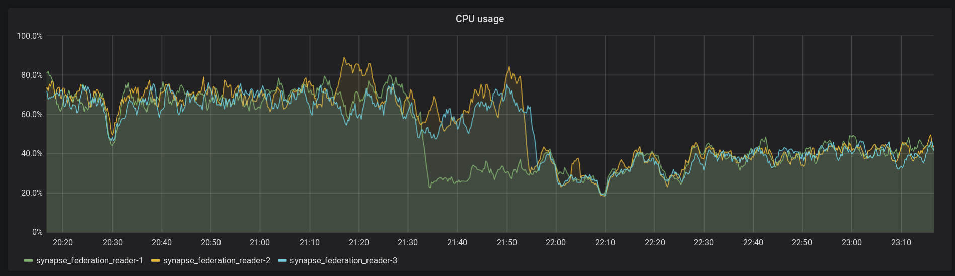 See 21:30 for the migration of federation reader 1, and 21:55 for the others. The federation reader is a particular pathological case, where the replacement of lists with iterators internally on Python 3 has given us some big boosts.