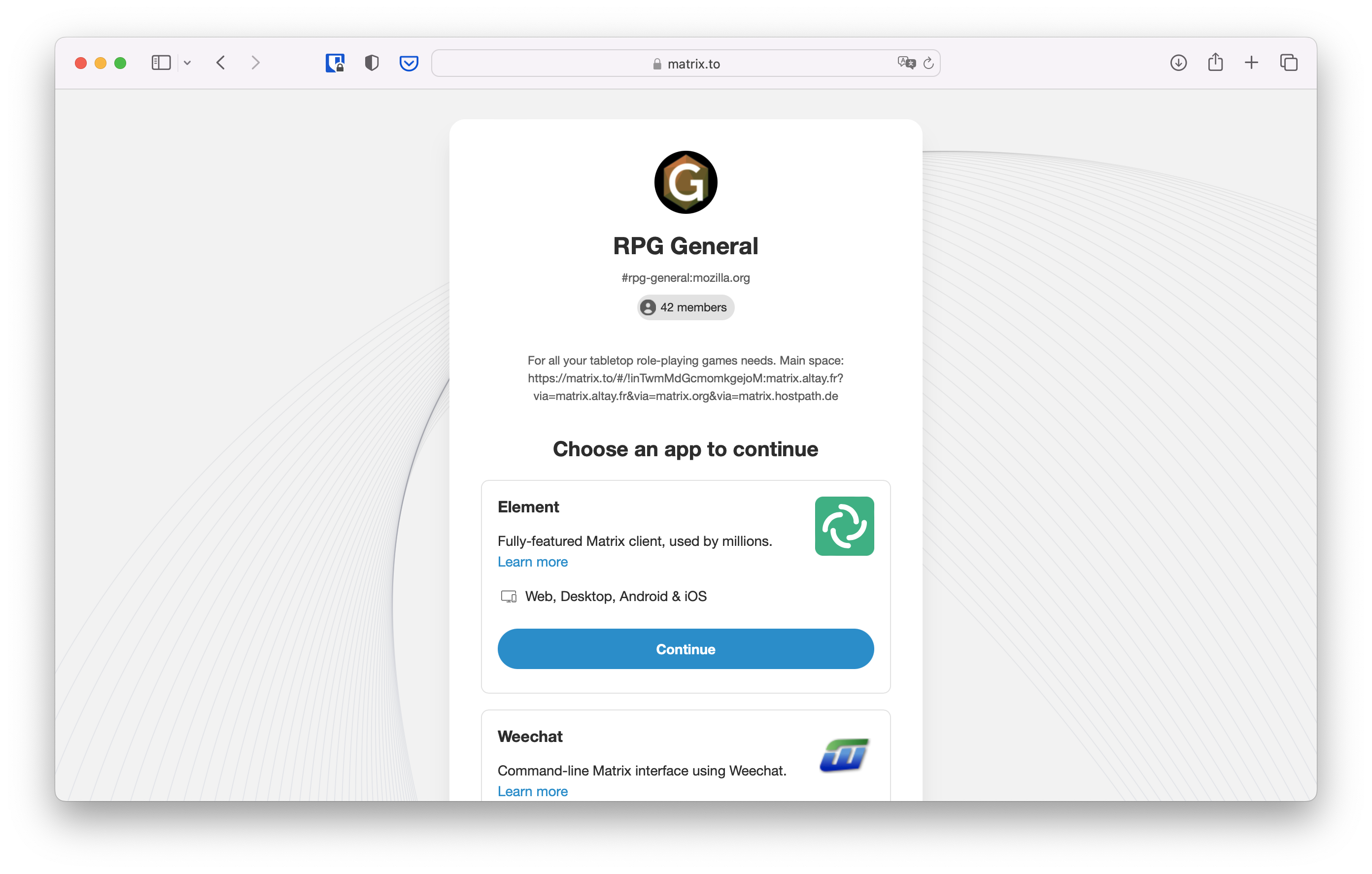 Someone might have shared a link that starts with matrix.to with you, or you might have stumbled upon it on a website. Those links will bring you to the public conversation you tried to join after asking you what client you want to use.
